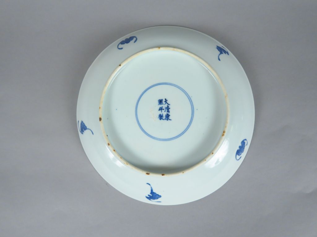 Coupe en porcelaine blanche, à décor bleu sous couverte de deux dragons poursuivant la perle sacrée parmi les nuages. Marque apocryphe Kangxi. Chine, période République, début du XIXème siècle. Diam. 23 cm