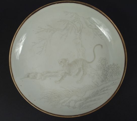 Coupe en porcelaine blanche, décor en grisaille d'un tigre en hiver. Chine deuxième moitié du XIXème. Diam.: 24,5 cm