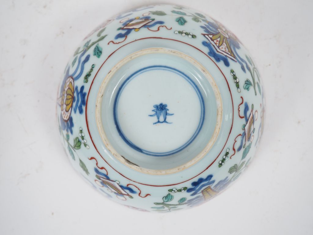 Coupe en porcelaine bleu blanc surdécorée en famille rose d'oiseaux et de fleurs. Chine, XVIIIème siècle. Marque double carpe. Diam. 14,5 cm
