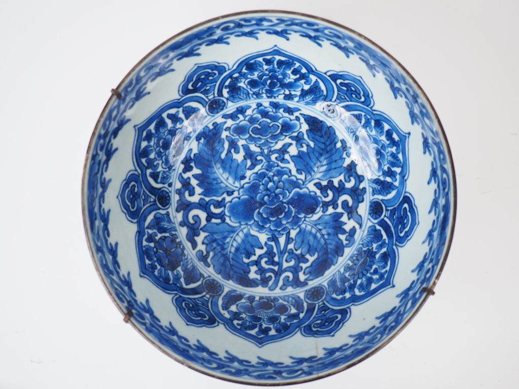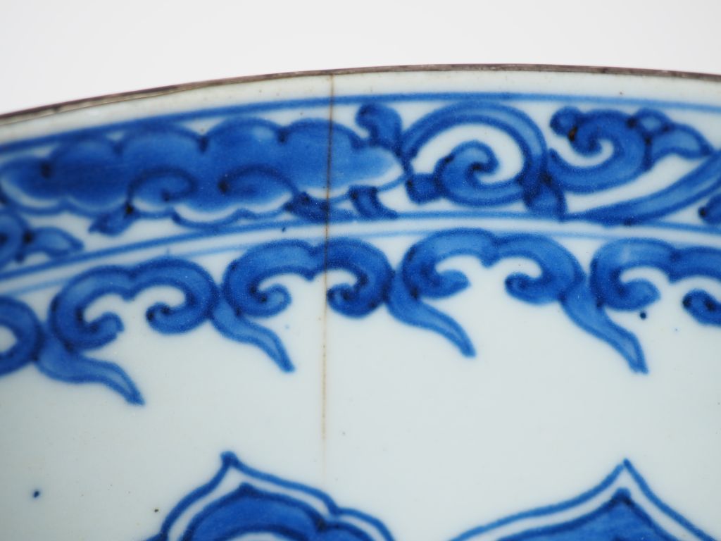 Coupe en porcelaine émaillée en bleu et rouge de fer sous couverte, à décor d'une guirlande de ruyi entourée de mille fleurs stylisées. L'intérieur représentant un bouton de lotus ouvert sur une branche de chrysanthème. Marque Kangxi sur la base. Chine, période Qing. Monture argent. Diam. 20 cm (fel)