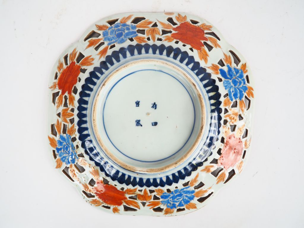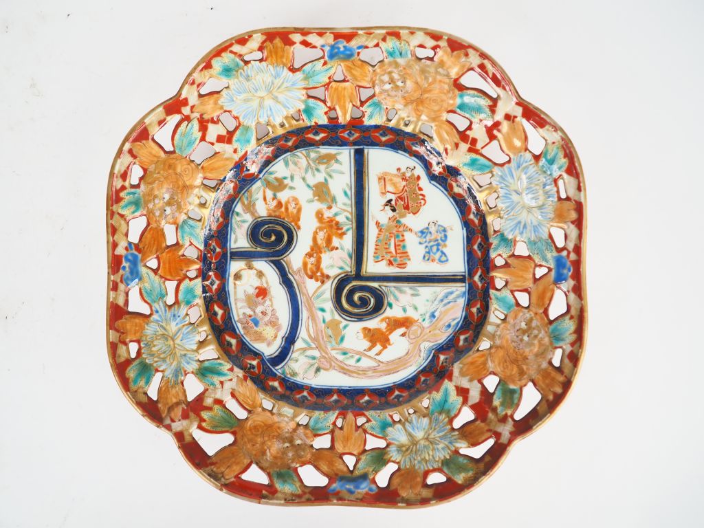 Coupe floriforme à décor ajouré de fleurs, de singes et de geisha Imari vers 1900 Diam. 31,5 cm