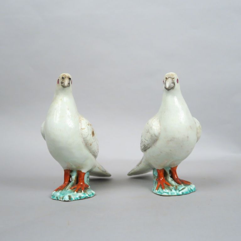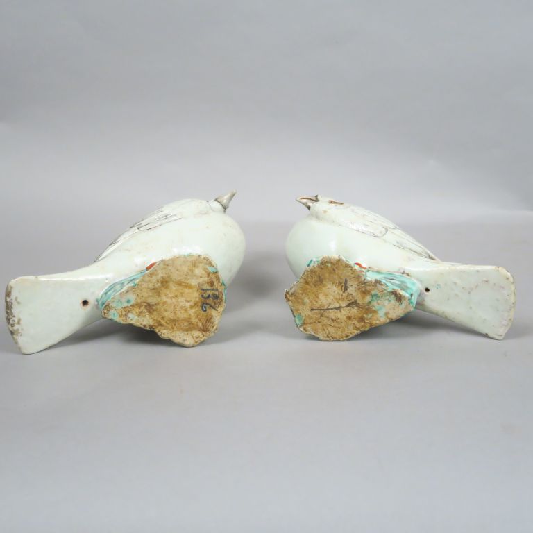 Couple de colombes en céramique émaillée blanc et corail. Chine, XIXème siècle. H. 18 cm et 17 cm