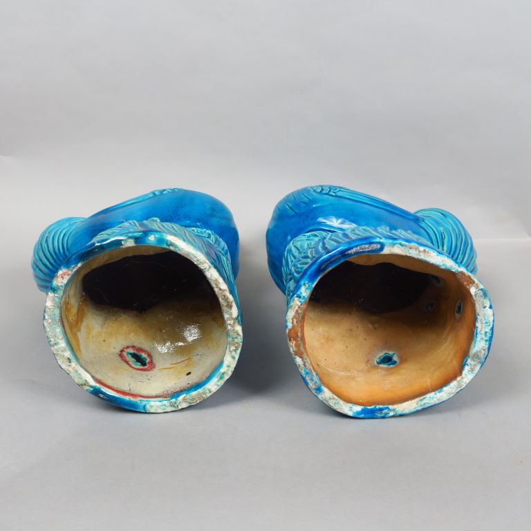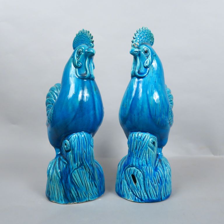 Couple de coqs en céramique émaillé turquoise. Chine, fin XIXème siècle. H. 35 cm et 34,5 cm