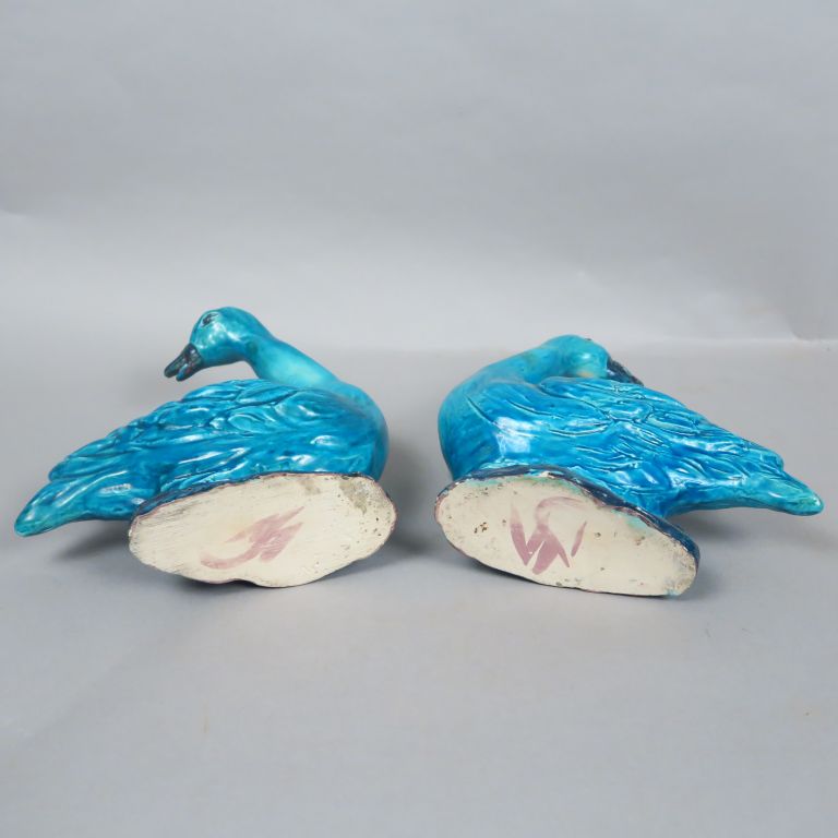 Couple de cygnes formant jardinières en céramique émaillé turquoise. Chine, vers 1900. H. 23 cm et 22,5 cm