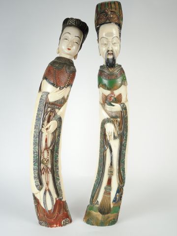 Couple de dignitaires en ivoire polychrome. Chine, vers 1930. H. 68 et 65,5 cm Poids : 6,3 kg et 6,3 kg Vente aux enchères conforme aux dernières instructions (17/11/2017) du Ministère transmises par le Conseil des Ventes.