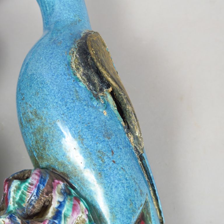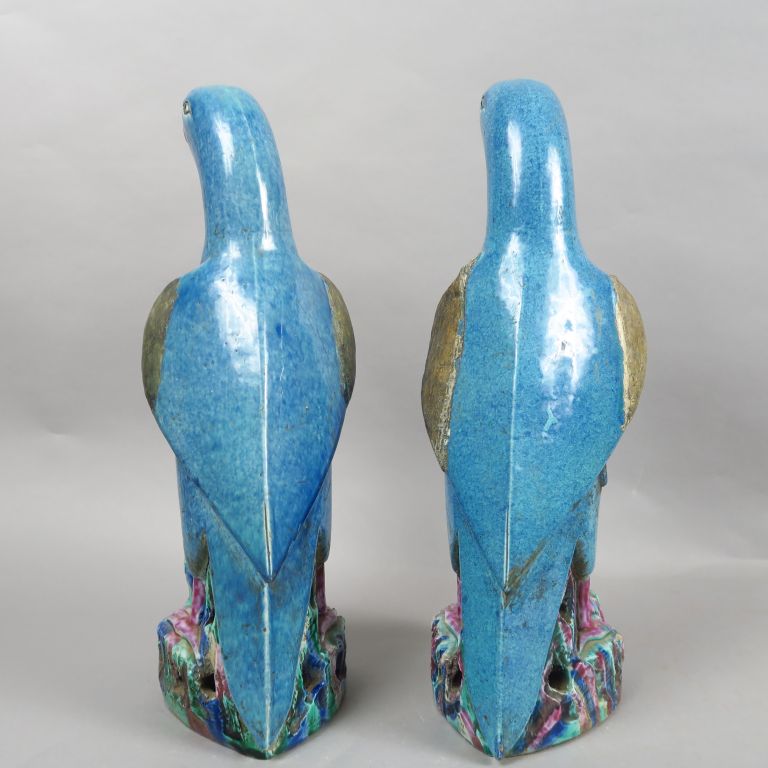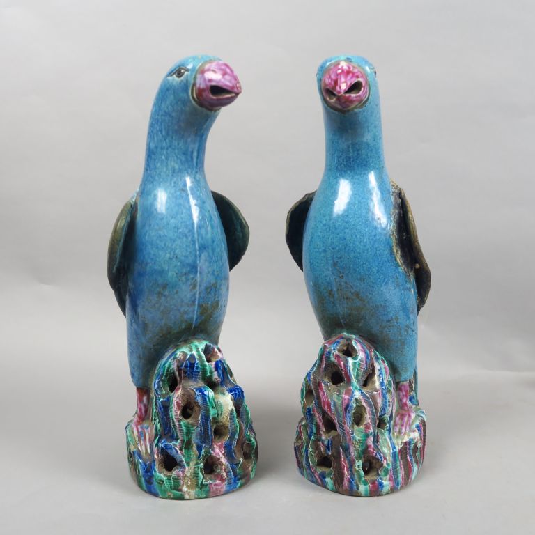 Couple de perruches en céramique émaillée bleu et arlequin. Chine, XVIIIème siècle (Accident) H. 34,5 cm