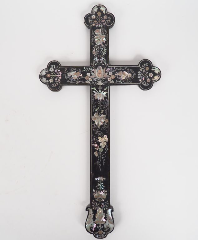 Croix Nham Dinh en bois naturel à décor en marqueterie de nacre de fleurs de lotus et de feuilles. Indochine vers 1900. Dim. 46,5 x 24 cm.