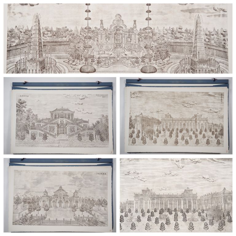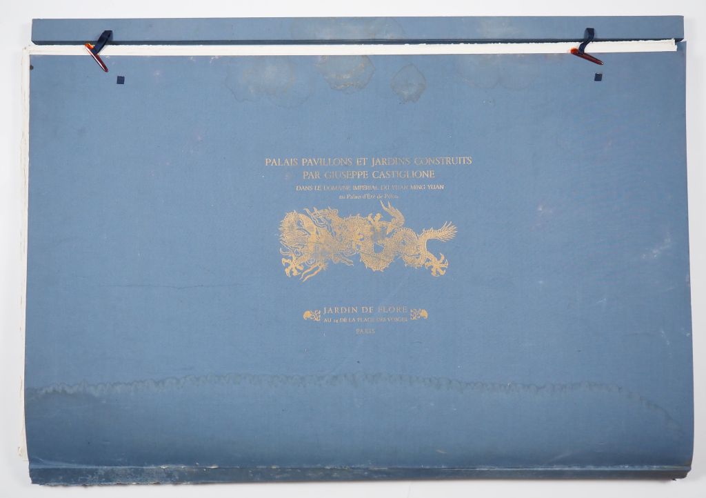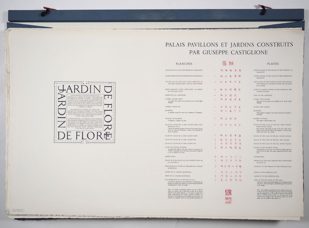 D'après Giuseppe CASTIGLIONE (1688-1766) « Palais Pavillons et jardins construits par Giuseppe Castiglione » dans le domaine impérial du Yuan Ming Yuan au Palais d’été de Pékin, comprenant vingt planches gravées à l’eau forte, par des artistes chinois, reprenant les compositions inventées par Giuseppe Castiglione entre 1783 et 1786. Edition jardin de Flore au 24 de la place des vosges, 1977. in-plano, 3 pp. de texte et 20 planches Dim. planches. 95 x 60 cm