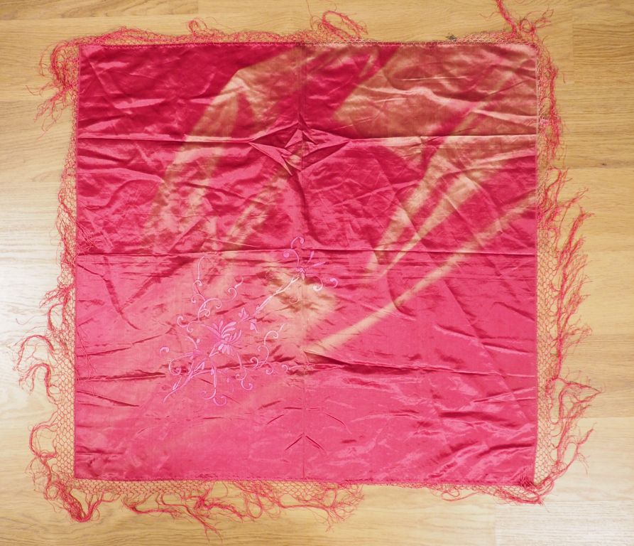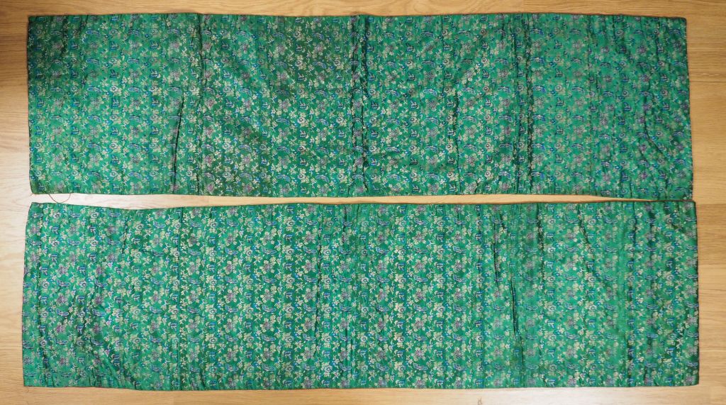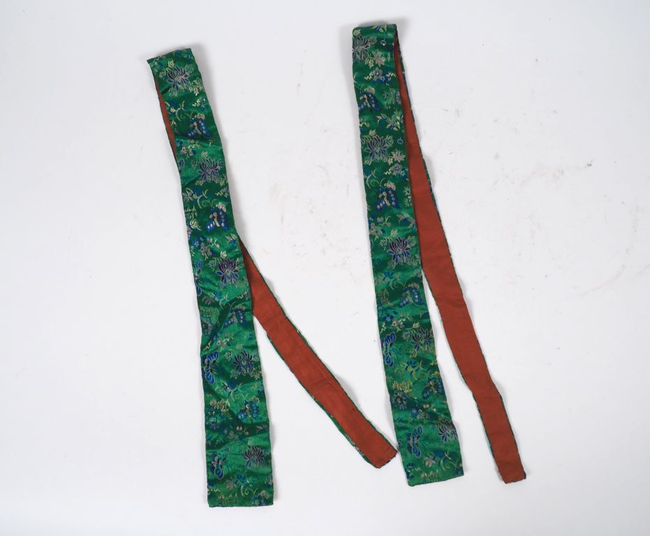 Deux bandes de soie polychrome brodée de fleurs et de papillons sur fond vert émeraude. On y joint deux fines bandelettes assorties et un châle en soie. (châle en mauvais état).