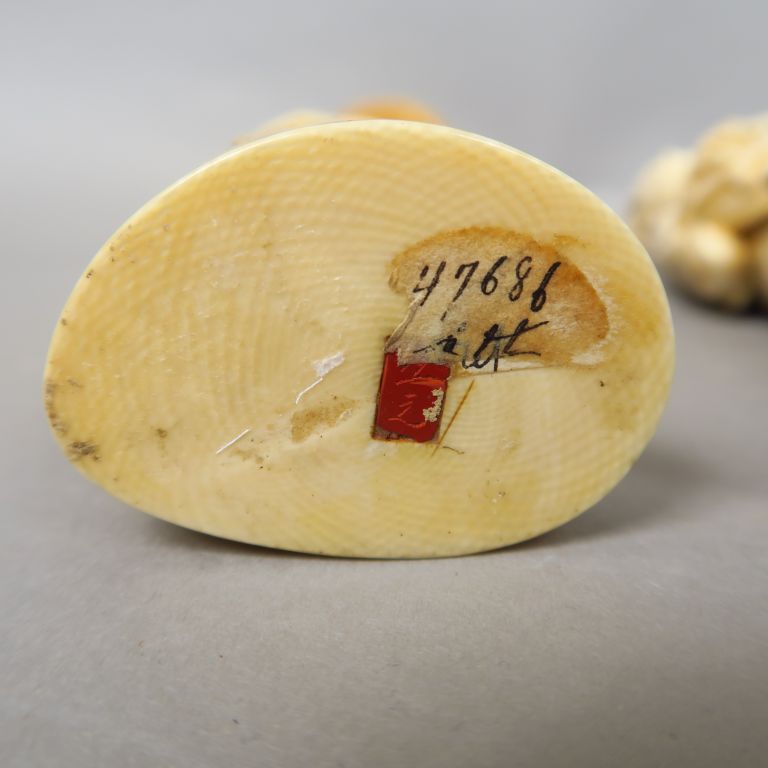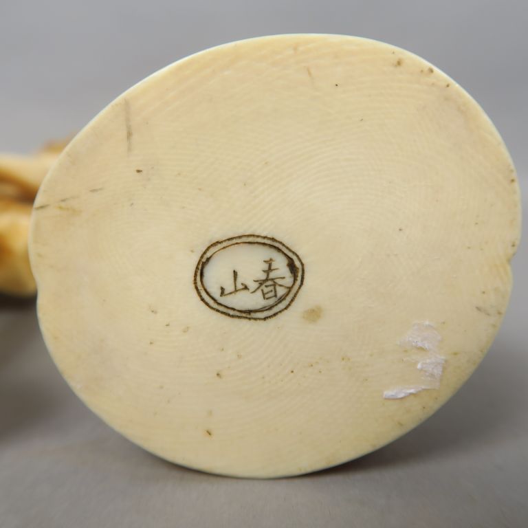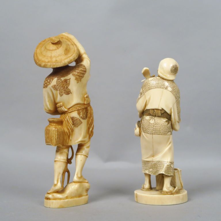 Deux okimonos en ivoire, l’un représentant un pêcheur avec harpon, l’autre, un joueur de shamisen. L’un, signé dans un cachet rouge. Japon, vers 1920. H. 18 cm et 16 cm Poids. 251 gr et 221 gr Nom scientifique de l’ivoire : ivoire d’éléphant Elephantidae spp (I/A, pré-convention), spécimen antérieur au 1er juin 1947 et conforme à la réglementation CE 338/97 du 09/12/1996, art. 2-W mc. Pour une sortie de L’UE, un CITES de ré-export sera nécessaire, celui-ci étant à la charge de l’acquéreur.