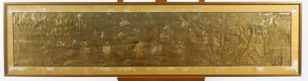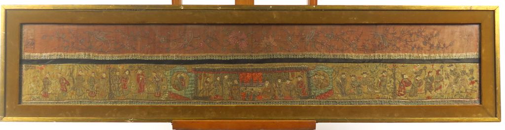 Deux panneaux de lin et soie brodés, à décor de personnages, de dignitaires et d'oiseaux branchés. Chine, XIXème siècle. 18,5 x 161,5 cm et 32 x 162 cm