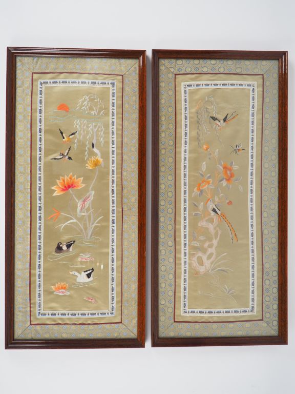 Deux panneaux en soie brodée représentant des oiseaux évoluant parmi des lotus et arbustes en fleurs sur fond céladon. Chine, vers 1900. 58 x 27 cm (encadrement inclus)