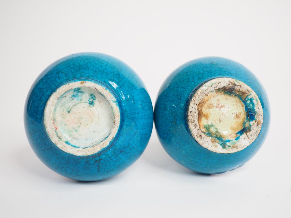 Deux petits vases bouteilles en porcelaine et émail bleu turquoise. Chine, période Qing. H. 14,5 cm et 15 cm (toute petite égrenure au col pour l'un)