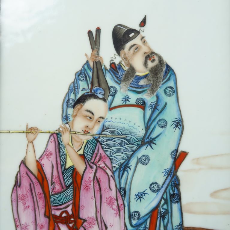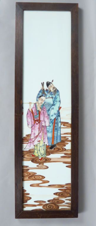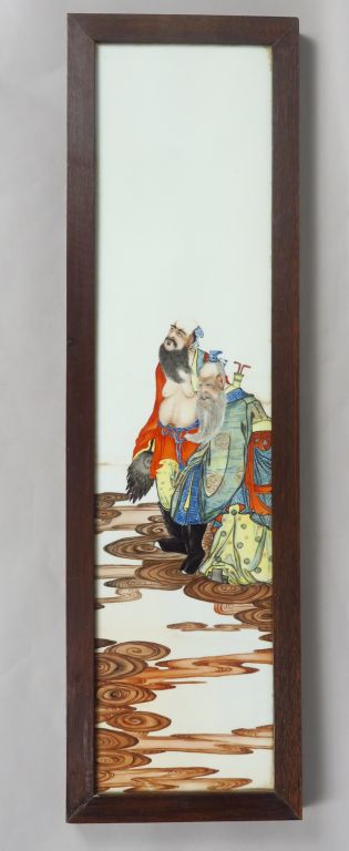 Deux plaques en porcelaine, d’une suite de quatre, chacune à décor polychrome de deux des Baxian, les huit Immortel taoïstes, parmi des nuées. Dans des encadrements en bois. Chine, début XXe siècle. Dim. plaque : 79,5 x 18,3 cm