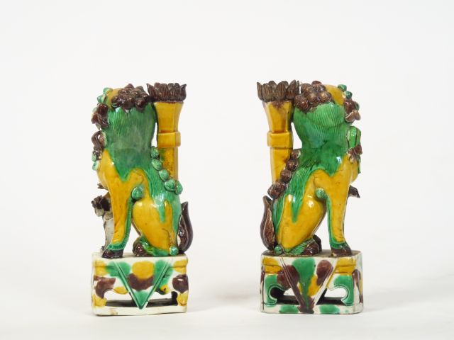 Deux porte-baguettes à encens formant pendant en biscuit émaillé sancai (vert, jaune et manganèse), représentant des chiens de Fô. Chine, période Kangxi, début XVIIIème siècle.