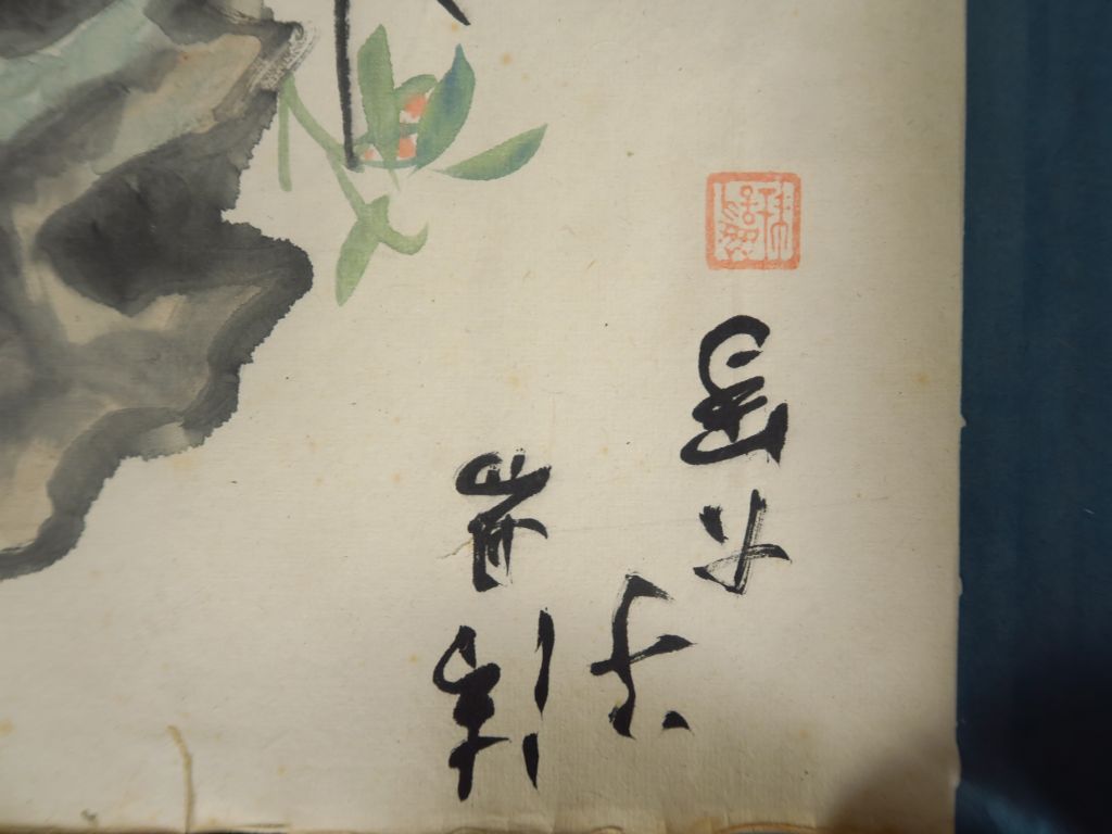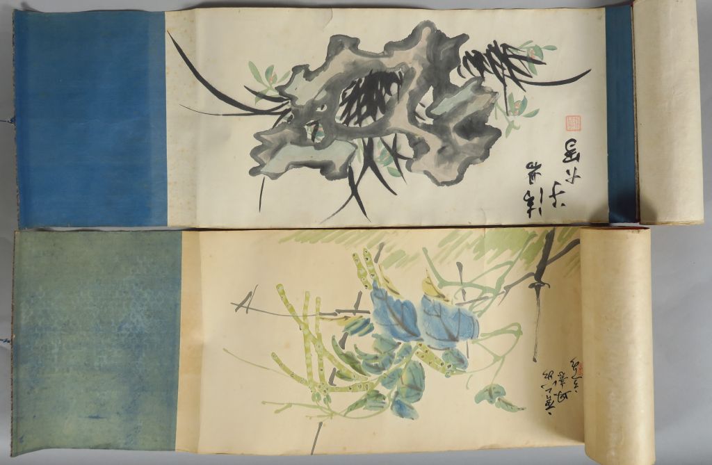 Deux rouleaux encre et couleurs sur papier, décor de fleurs et végétaux, avec les pierres à encre. Chine, vers 1960. H. 23 cm (accidents)