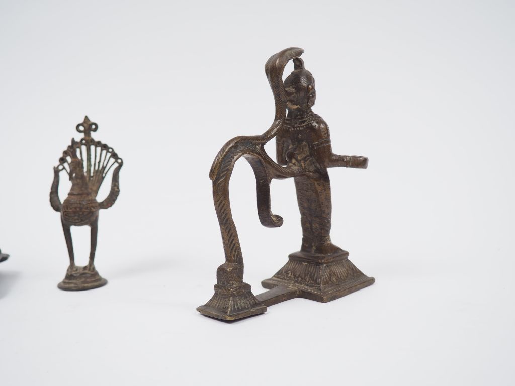 Deux statuettes en bronze représentant le taureau Nandin et un personnage légendaire sous un serpent. Inde du Nord, fin XIXème - début XXème. H. 8 cm et 14,5 cm On y joint une statuette en bronze représentant un paon.