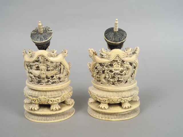 Deux statuettes en ivoire représentant un couple impérial assis sur leur trône respectif. Chine, vers 1930. H. 19 cm et 19,5 cm Poids. 1869 gr
