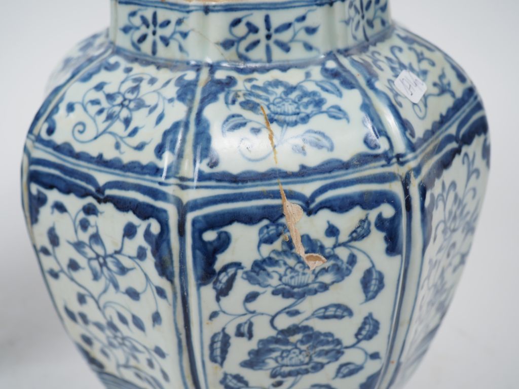Deux vases bleu blanc de forme balustre et hexagonale, à décor de phoénix pour l'un et de fleurs pour l'autre. Chine, XXème siècle, dans le style des Ming. Marque apocryphe Xuande pour l'un. H. 24 cm et 41 cm