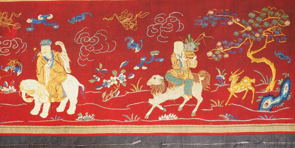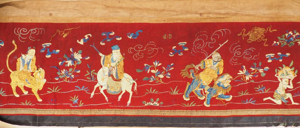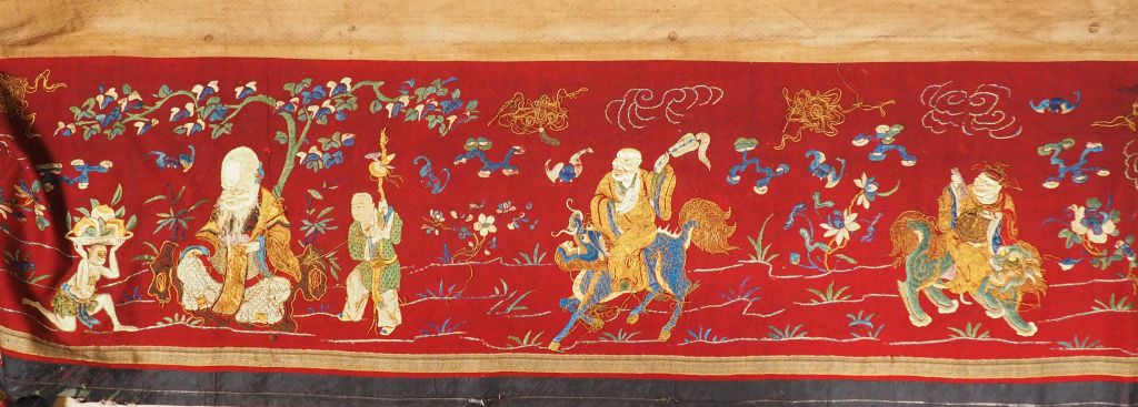 Devant d'autel en lin brodé et fils d'or, à décor des huit immortels. Chine, deuxième moitié du XIXème siècle. 61,5 x 510 cm