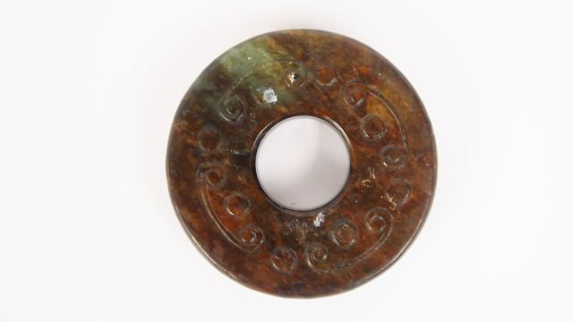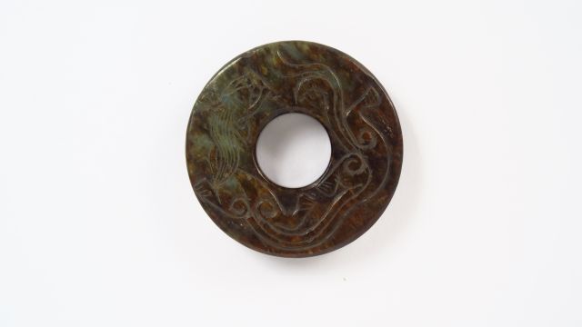 Disque bi en jade vert et brun, décor de dragons et motifs géométriques et stylisés. Chine, XIXème siècle. Diam. 6 cm