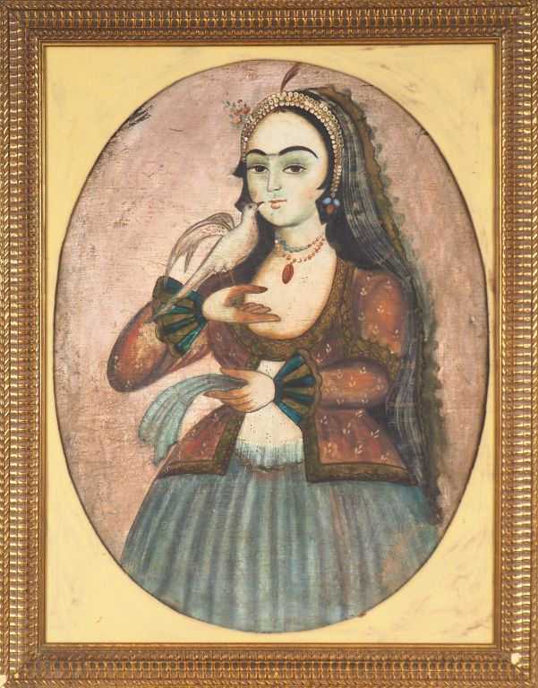 Ecole persane fin XIXème - début Xxème. "Jeune fille à l'oiseau". Huile sur toile. Dim. 79 x 65,5 cm.