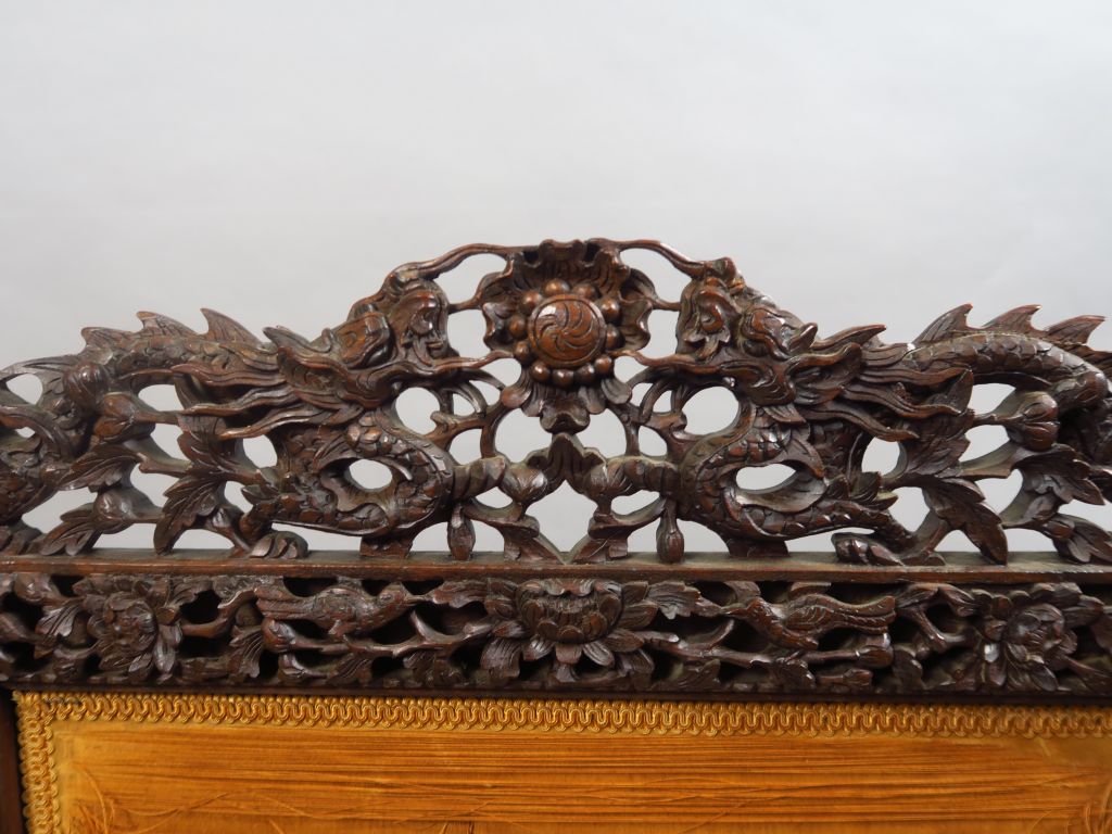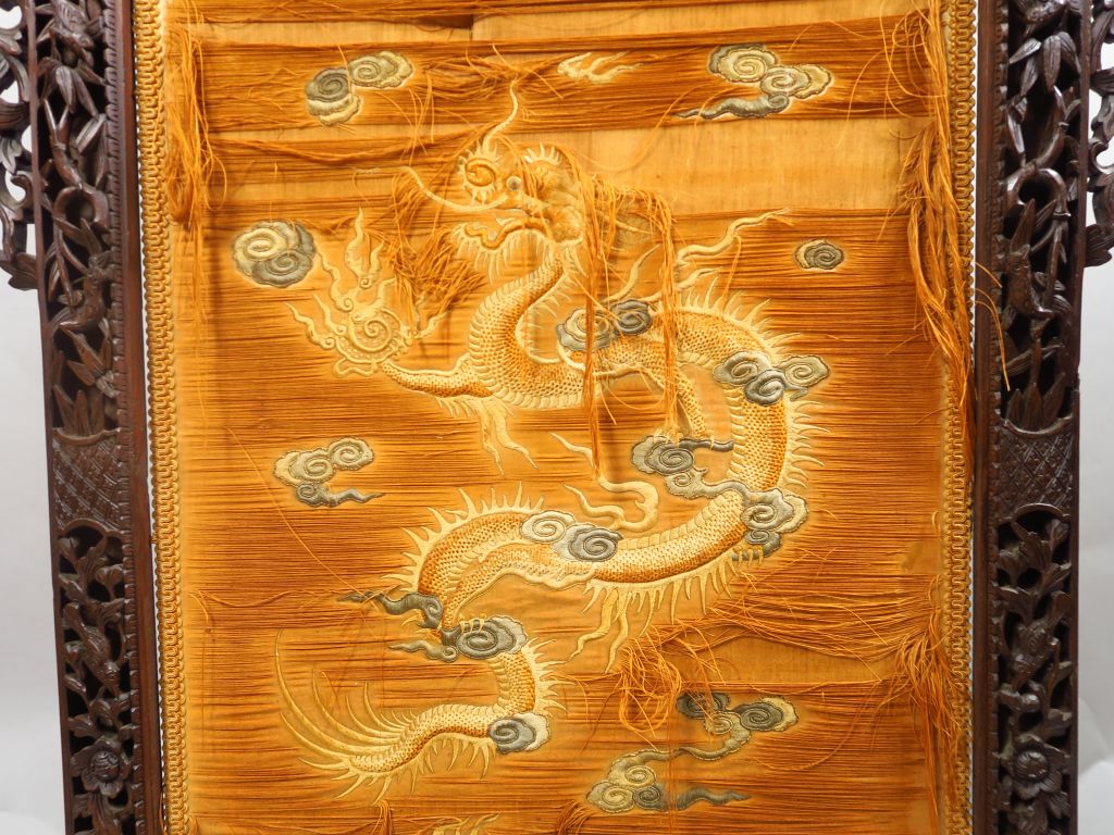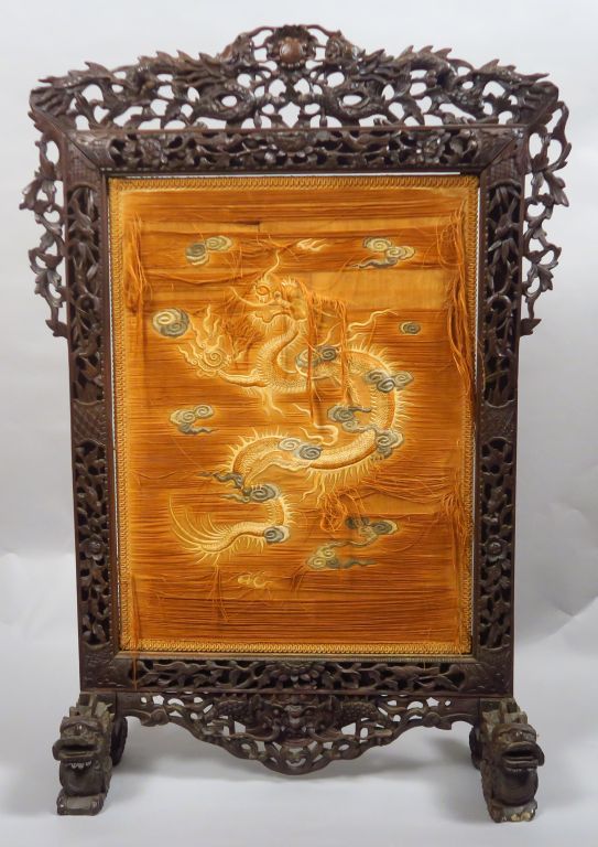 Ecran de cheminée en bois de fer, à décor sculpté et ajouré d'animaux et de rinceaux feuillagés. Garniture de soie, à décor de dragon (accidentée). Indochine, vers 1900. H. 94 cm