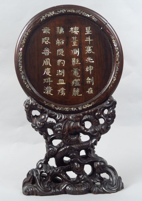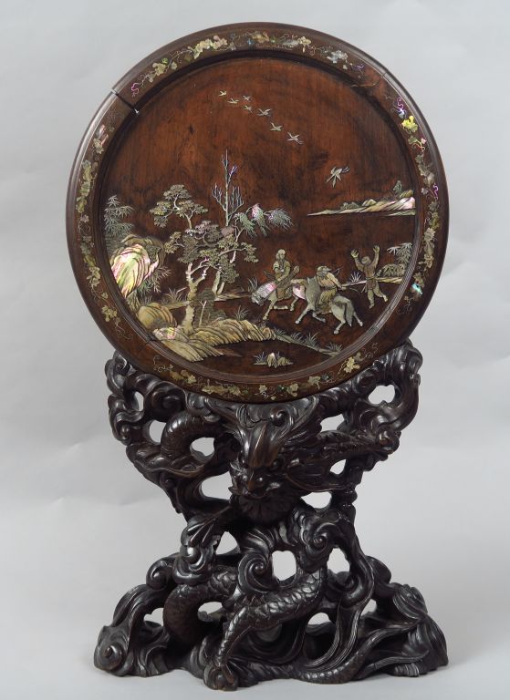 Ecran de table en bois de rose et incrustations de nacre, à décor d'une scène de chasse à cheval se déroulant dans un paysage arboré, au revers décor de calligraphies. Indochine, vers 1900/1920. Diam. 30,5 cm H. du socle : 23 cm