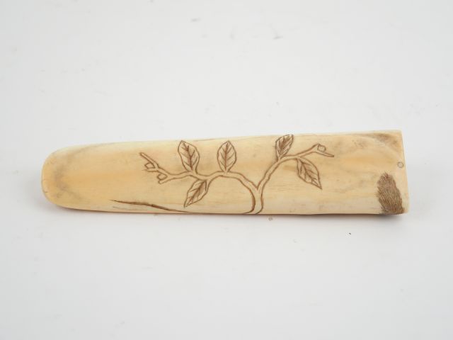 Elément de manche de sabre japonais en ivoire sculpté, à décor de rats et de grenouille. Vers 1900. L. 13,5 cm