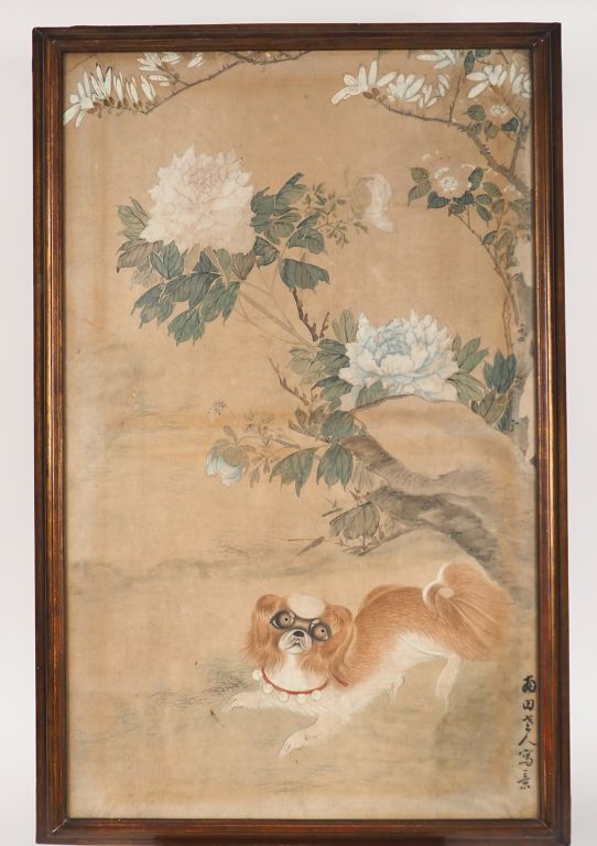 Encre et couleurs sur papier représentant un chien Shitsu sous un pivoinier en fleurs Chine XIXème Dim. 85 x 52 cm