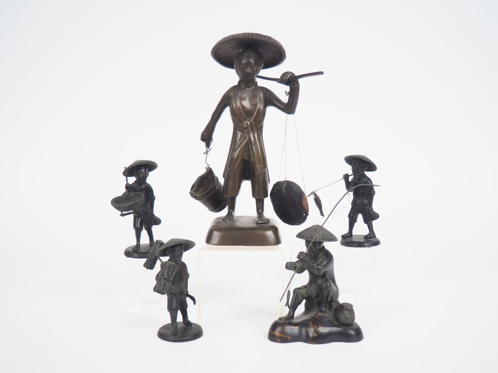 Ensemble 5 petits sujet en bronze représentant des pêcheurs et paysans. Indochine vers 1920