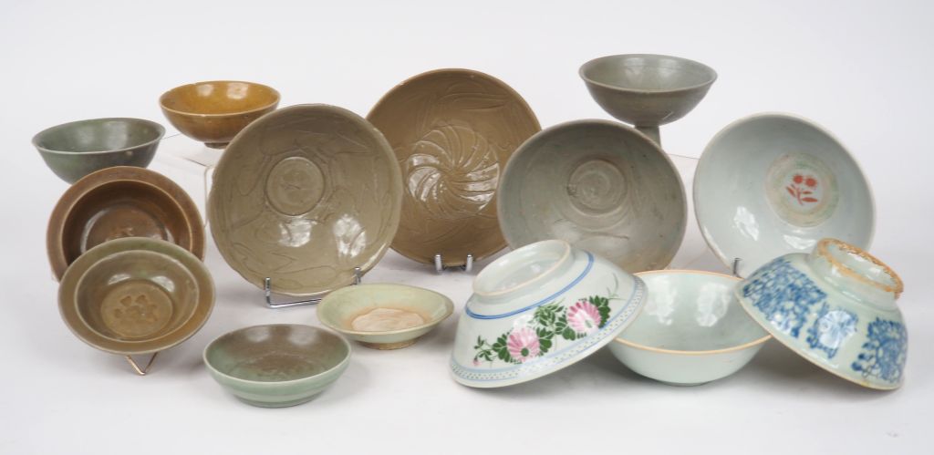 Ensemble comprenant quatorze coupes et coupes sur pied dans le style des Song et des Ming en céladon, brun clair etc. Chine du Sud, vers 1900. Diam. variant de 11,5 cm à 18 cm