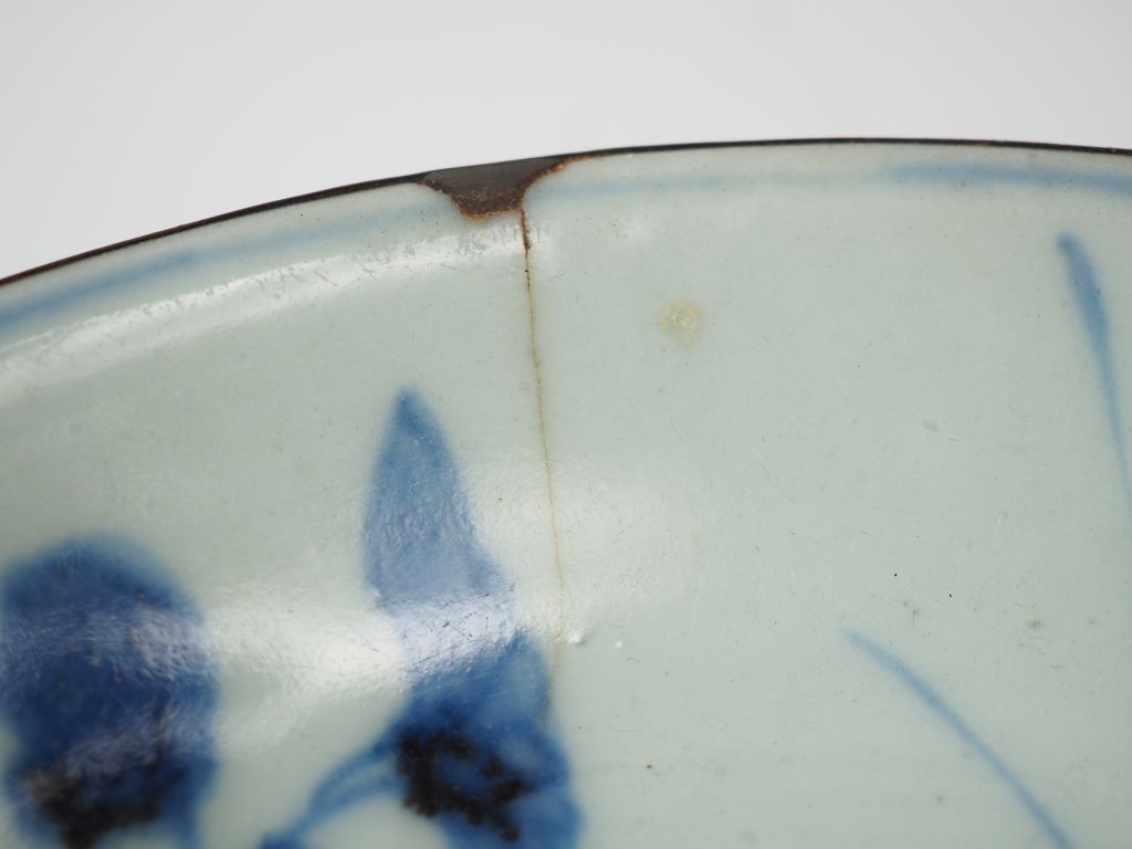 Ensemble comprenant : - une coupe en porcelaine de Canton Diam. 22 cm (fel) - une assiette en porcelaine de Canton Diam. 21 cm - trois petites assiettes en porcelaine de la famille rose sur fond céladon à décor d'oiseaux, papillons et fleurs Diam. 18 cm - une coupe en porcelaine bleu blanc, à décor de fleurs et rochers. Faites pour le Vietnam. Diam. 19 cm
