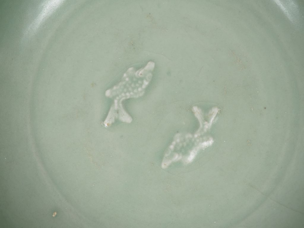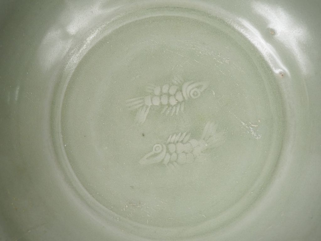 Ensemble comprenant : une grande et une petite coupes creuses en porcelaine et émail céladon, à décor de poissons sous couverte. Chine, période Ming. Export pour le Sud Est asiatique. Diam. 27,5 cm et 19,5 cm (l'un d'eux felé)