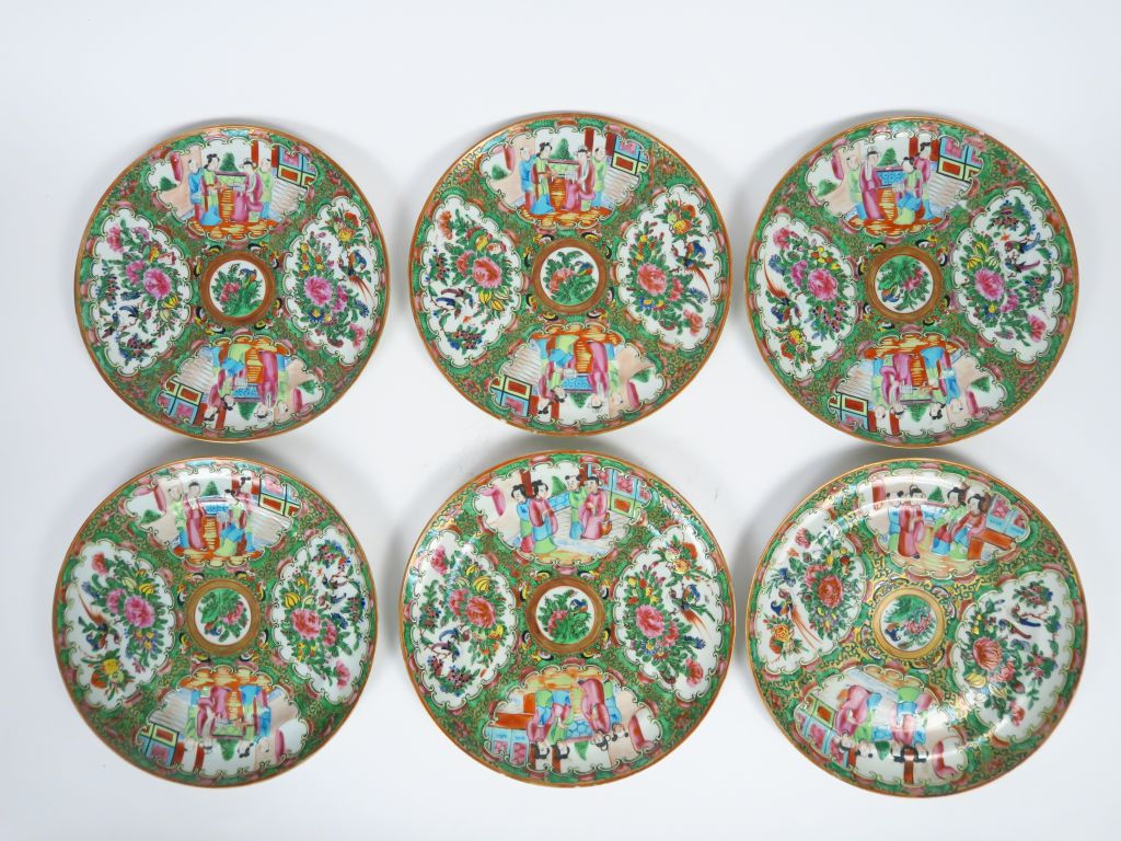 Ensemble de 13 assiettes en porcelaine de Canton, décor divers de scènes de personnages, de fleurs et de végétaux. Chine vers 1900. Diam. 20,5 et 24,5 cm (quelques égrenures)