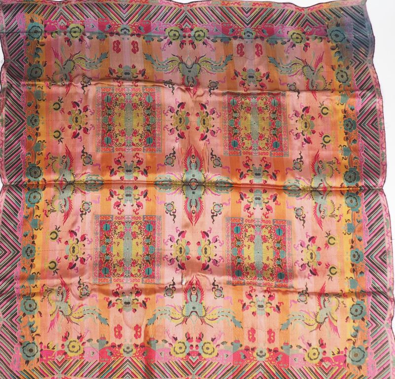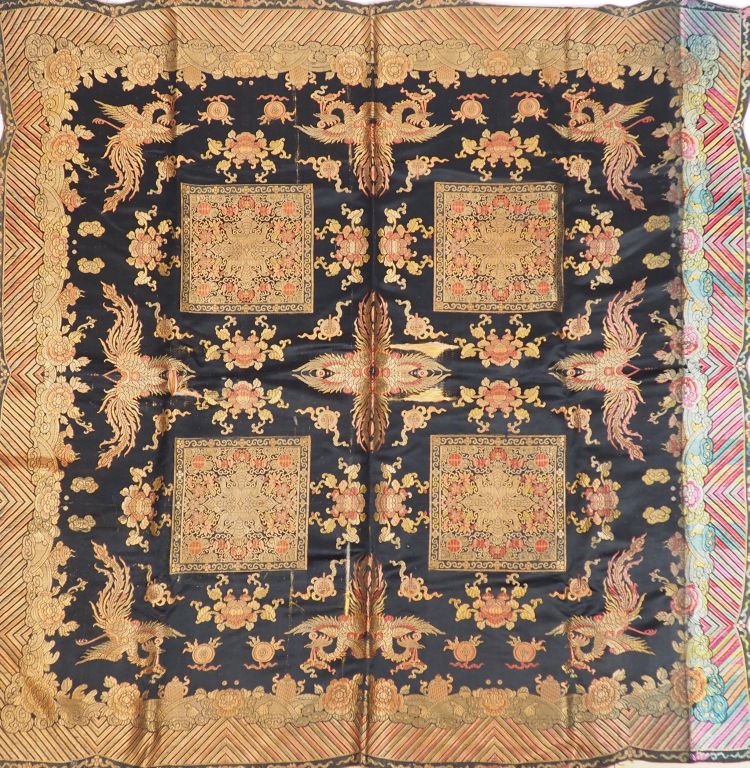 Ensemble de neuf broderies et textiles. On y joint un rang de mandarin à décor de phoenix.