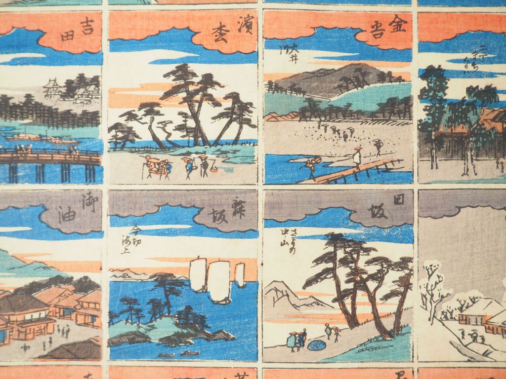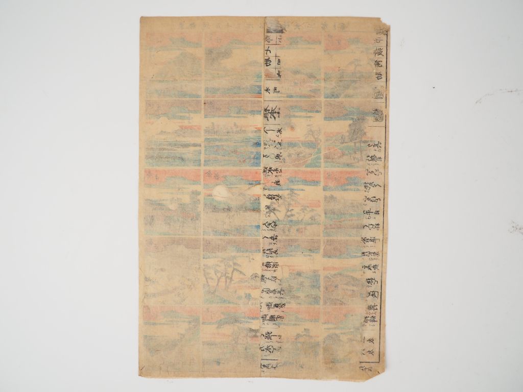 Ensemble de six estampes, dont : - HIROSHIGE II, oban-tate-e Représentant les 53 stations du Tokaido en vignettes , - TOYOKUNI III, Oban yoko-e, Acte III du Chushingura - KUNIMARO, oban tate-e d’une série du Tokaidô, et trois autres estampes par Hiroshige et Toyokuni III (Salissures et accidents)