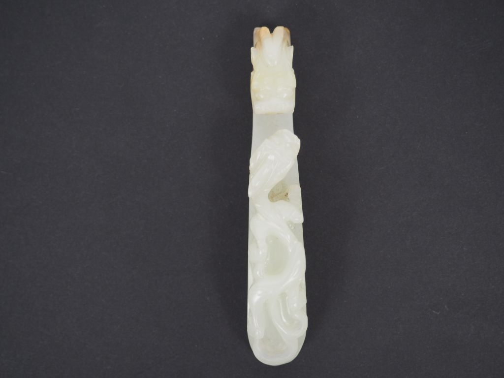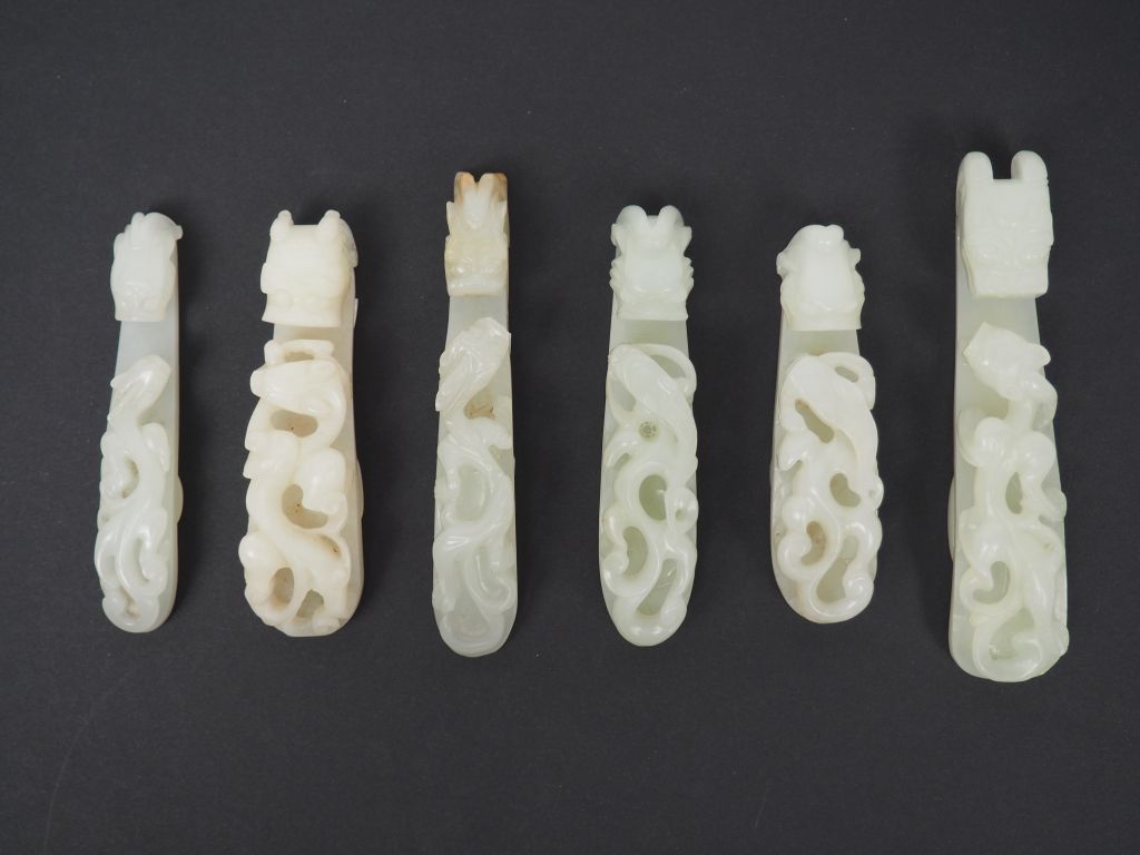 Ensemble de six fibules en jade blanc céladon décor de double dragon. Chine. Dim. 8 à 10 cm