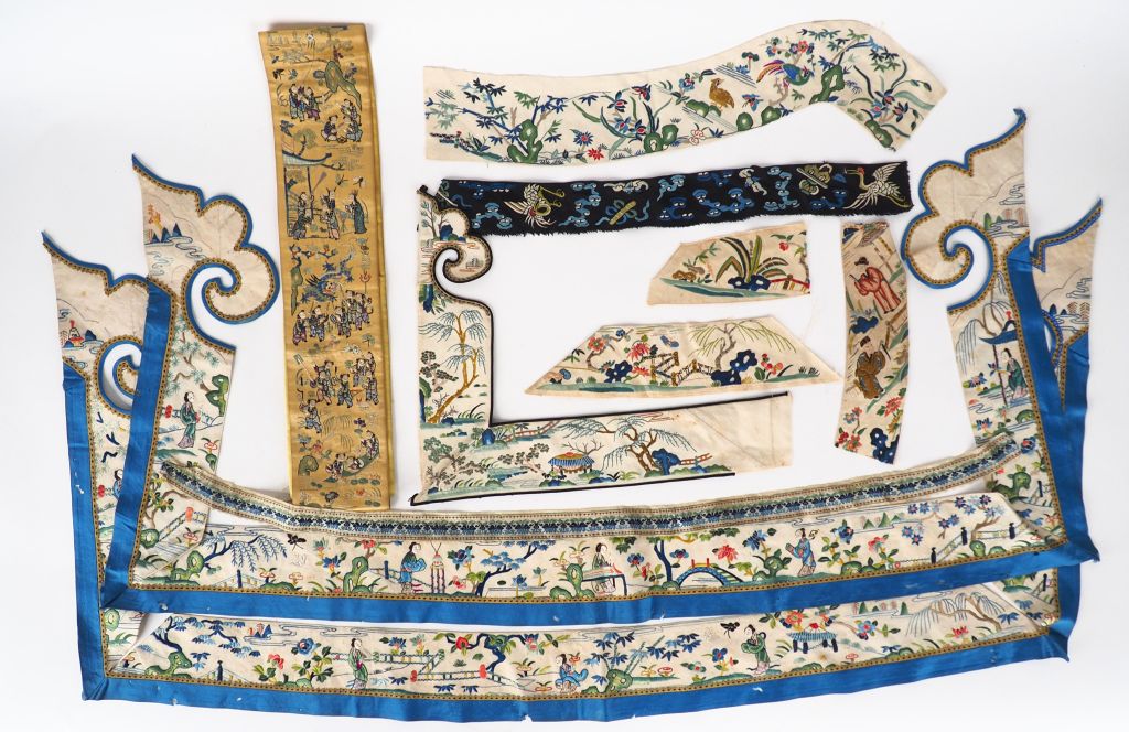 Ensemble d'éléments de tissu, fond polychrome de personnages, d'oiseaux, de fleurs et de végétaux ( petites déchirures ).