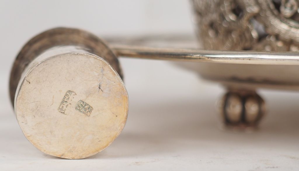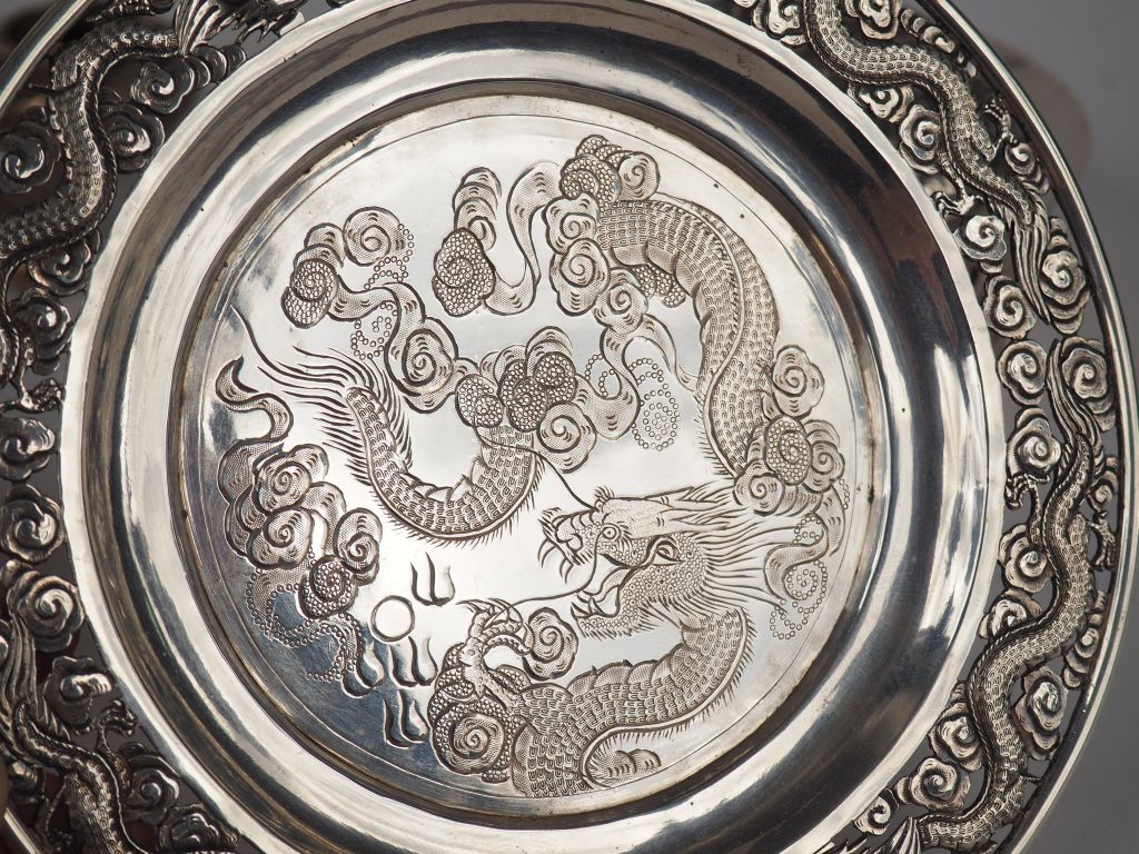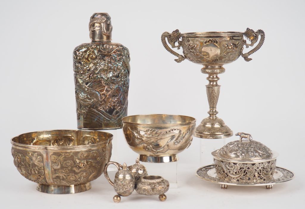 Ensemble d'objets en argent étranger : trophée, une coupe polylobée, coupe couverte ajourée, une coupe à décor de dragons, une flasque à décor de dragons, salerons. 6 pièces. Poids : 1765 g.