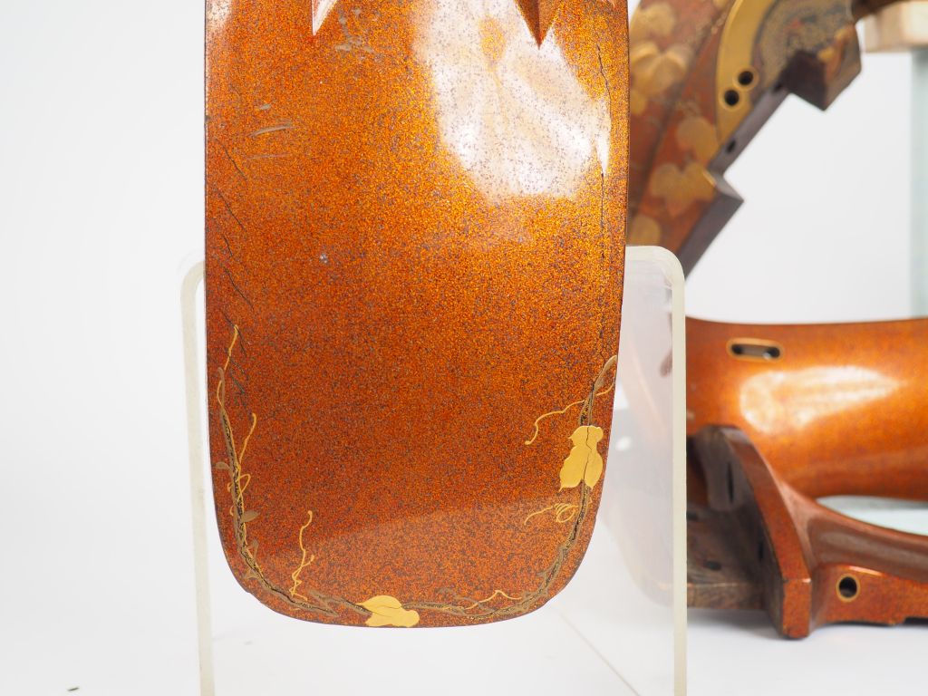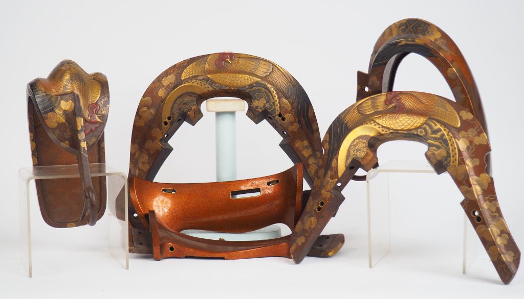 Ensemble kura et deux abumi, en bois laqué à fond nashiji, le décor en hiramaki-e et takamaki-e de laque or, argent, noire et rouge, en suite sur les étriers et les faces externes du pommeau (maewa) et du troussequin (shizuwa) de la selle, représentant un coq sur un tambour de guerre sur lequel grimpe du lierre , ce thème étant un symbole de paix. Un des montants latéraux iqi portant la date apocryphe, 2e année de l’ère Kôji (1556). Japon, XIXème siècle. (Plusieurs lacunes de laque et craquelures , la selle démontée en quatre parties) H. max. étriers : 25 cm L. max. selle : ca. 38 cm