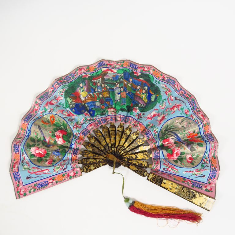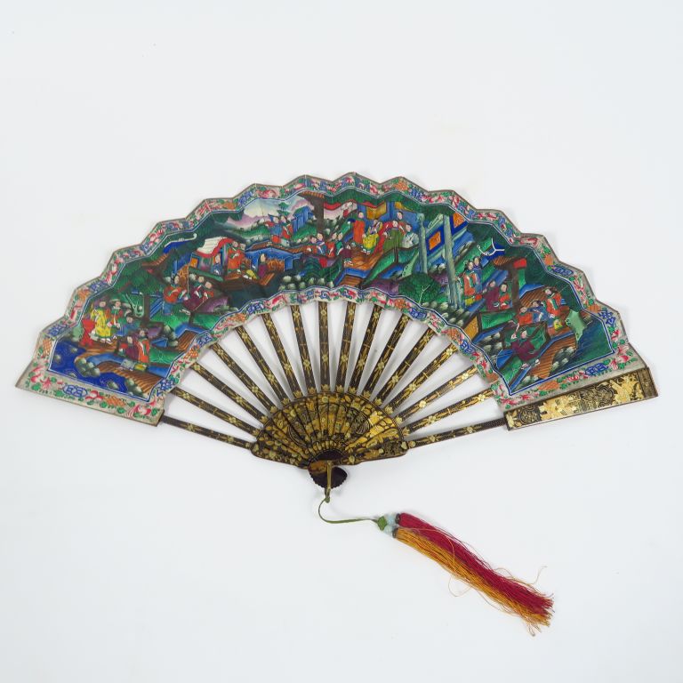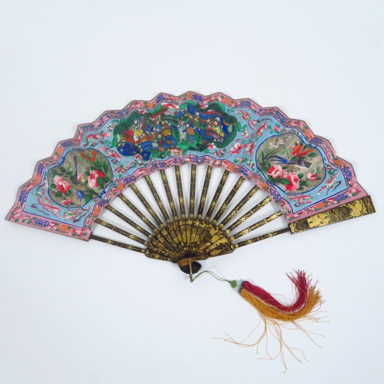 Eventail, à décor peint sur papier de scène de palais animée de personnages, d'oiseaux et de compositions florales. Les têtes en ivoires, les bruns laqués or et noir. Chine, travail de Canton. H. 19,5 cm Dans son coffret.