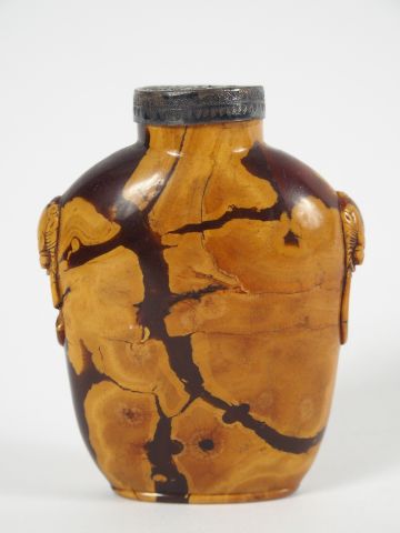 Flacon tabatière en écaille, orné de deux têtes de dragon, bouchon en argent. Chine XIXème. H. : 7,5 cm