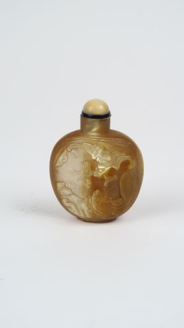 Flacon tabatière en nacre, décor d'une chauve-souris tenant un lingzhe face à un lion. Chine, vers 1900. H. 5,4 cm