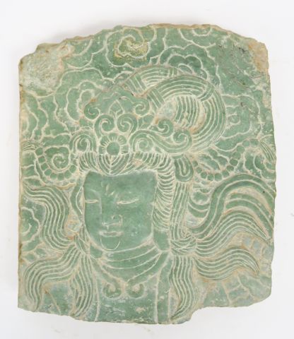 Fragment de pierre décoratif à décor de divinité Extrême-Orientale. Dim. 22 x 19,5 cm