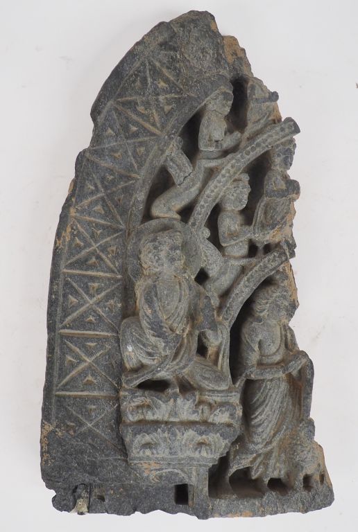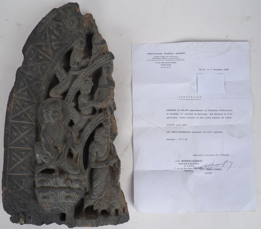 Fragment de relief représentant la première prédication du Boudha (?) entouré de Maitreya, des Apsaras et d'un assistant, reste visible un des lions support de trône. Schiste gris bleu. Art Greco-boudhique Gandhara II - IIIème siècles. H. 37,5 cm. (Accompagné d'un certificat étalbi en 1988 par J-C Moreau-Gobard.