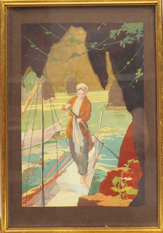 Gouache aquarellée rehaussée d'or représentant une jeune femme sur une petite jonque sur la Baie d'Along. Vietnam, vers 1930. 29 x 19 cm