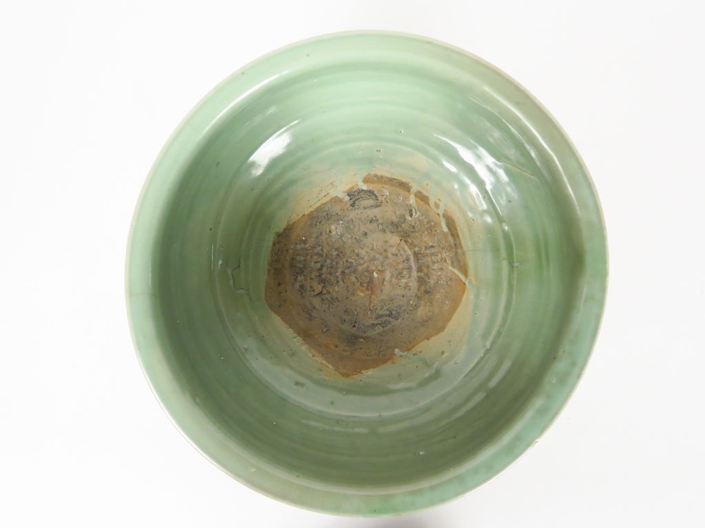 Grand-brûle parfum tripode en porcelaine et émail céladon, décor sous couverte de fleurs stylisées. Chine, XVème siècle. Diam. 32,5 cm (restaurations)