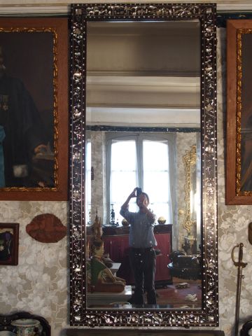 Grand miroir Indochinois en marqueterie de nacre et bois de rose, à décor de personnage chevauchant des animaux fantastiques. 218 x 99,5 cm (petits manques)
