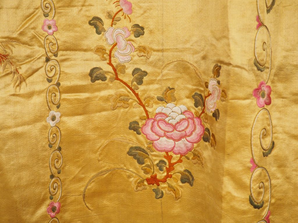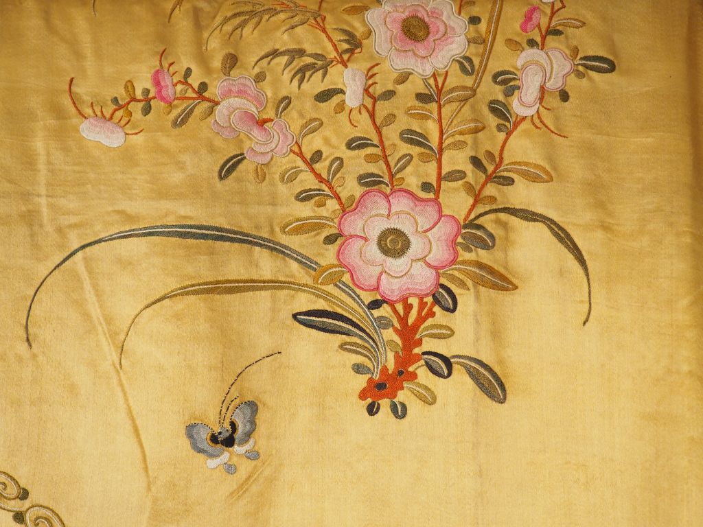 Grand panneau en soie et lin brodé décor de grues, oiseaux et papillons dispersés autour d'un bouquet de chrysantèmes. Indochine, vers 1920. 202 x 218 cm